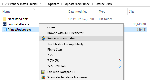 - بر روی فایل PrinceUpdate.exe راست کلیک نمایید و بر روی گزینه Run As Administartor کلیک کنید.