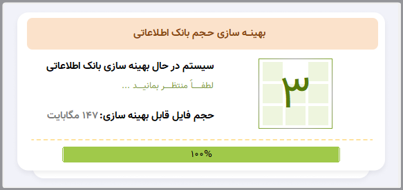- پس از پایان عملیات بروز رسانی، عملیات بهینه سازی حجم بانک اطلاعاتی انجام می شود و صفحات زیر را مشاهده خواهید نمود.