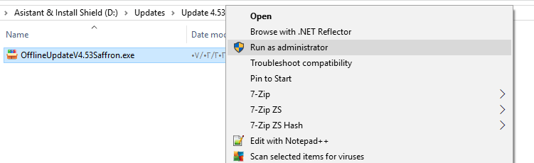 - بر روی فایل SaffronOfflineUpdateEngine.exe راست کلیک نمایید و بر روی گزینه Run As Administartor کلیک کنید.