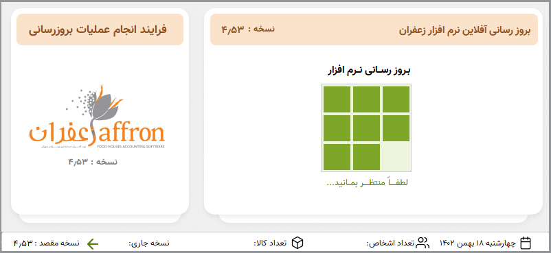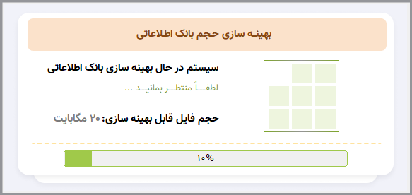 - پس از پایان عملیات بروز رسانی، عملیات بهینه سازی حجم بانک اطلاعاتی انجام می شود و صفحات زیر را مشاهده خواهید نمود.